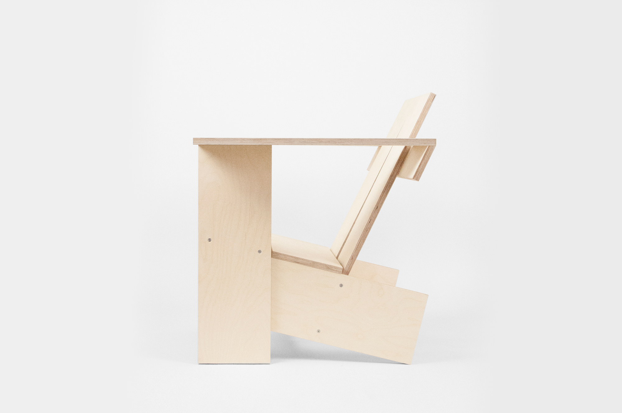 Fauteuil constitué de onze planches de contreplaqué de bouleau. Ce chiffre fait référence à la Wesport chair (Thomas Lee, 1903), fauteuil d’extérieur populaire aux États-Unis qui était initialement construit en onze morceaux.