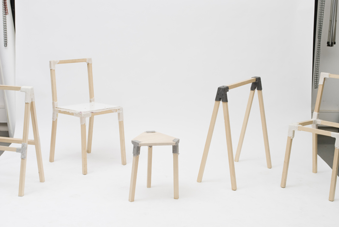 Pièces de connexion: surmoulage plastique sur tasseaux de bois Impression 3d en ABS, polyéthylène, pin Réalisé dans le cadre du Fablab de l’Ensci © Adrien Goubet